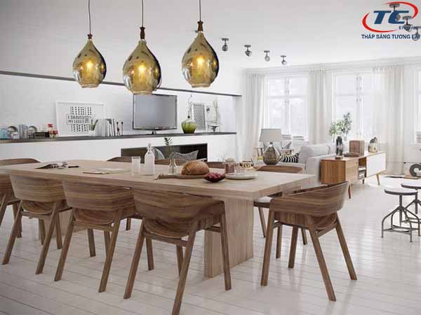 Đối với không gian rộng thì bạn có thể lựa chọn những mẫu đèn thả trần sử dụng bóng đèn led bên trong hoặc những đèn bàn ăn có 3 chế độ màu: Trắng, trung tính, vàng để có thể dễ dàng điều chỉnh phù hợp với không gian.