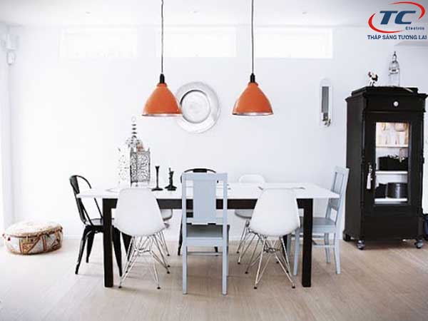 Với tông màu tương phản giữa đèn và bàn ăn sẽ làm cho không gian phòng ăn của bạn trở nên sinh động và ấn tượng hơn rất nhiều.